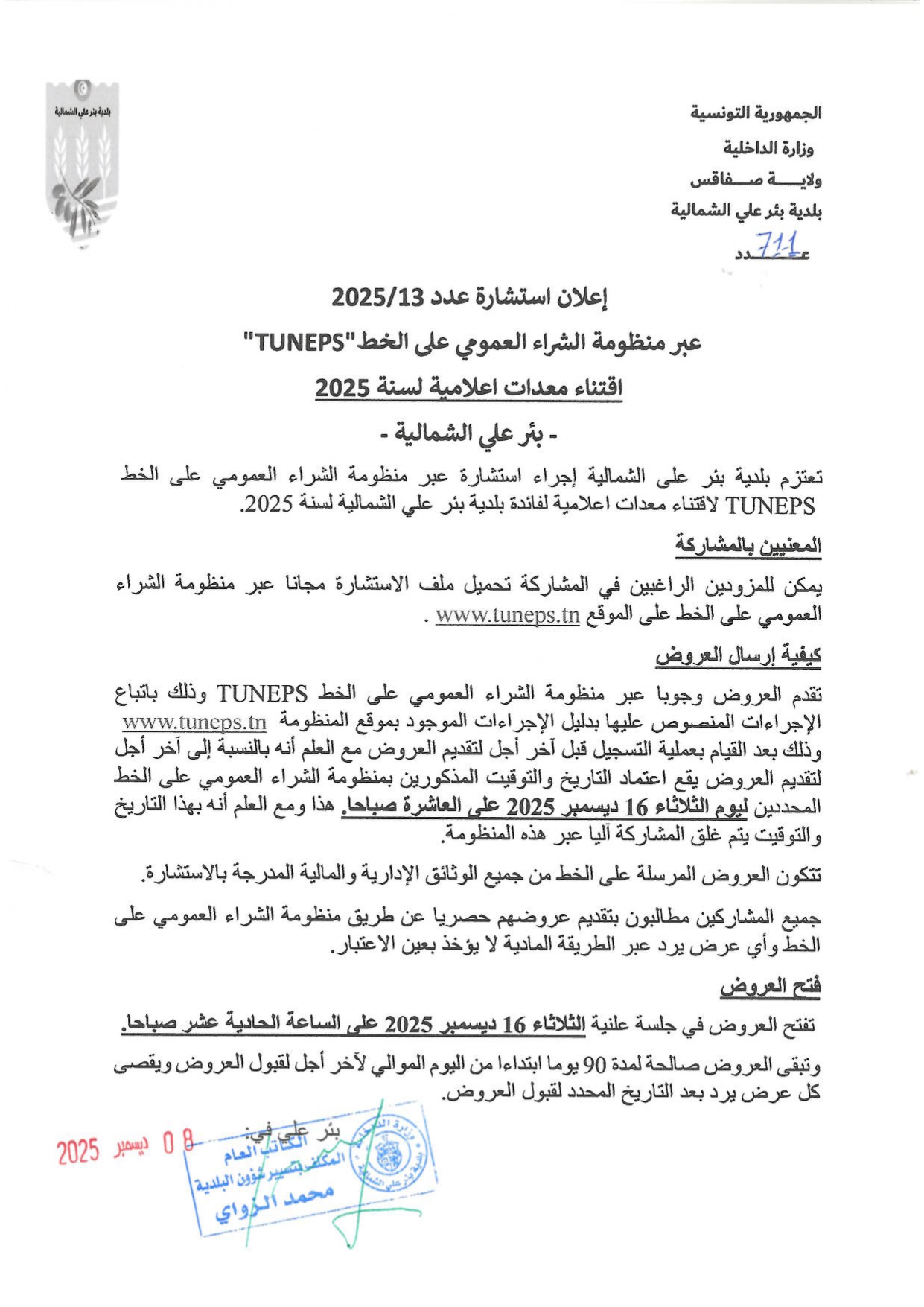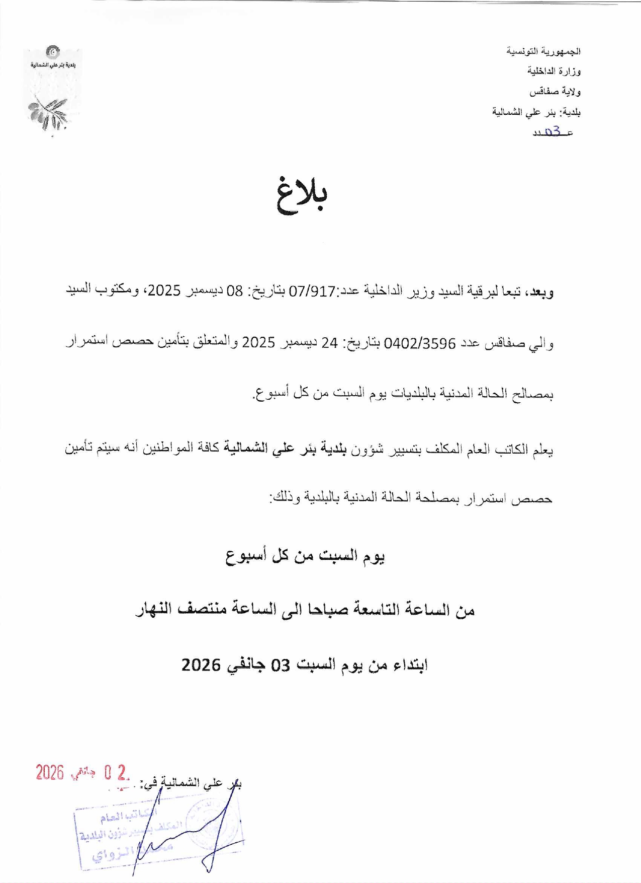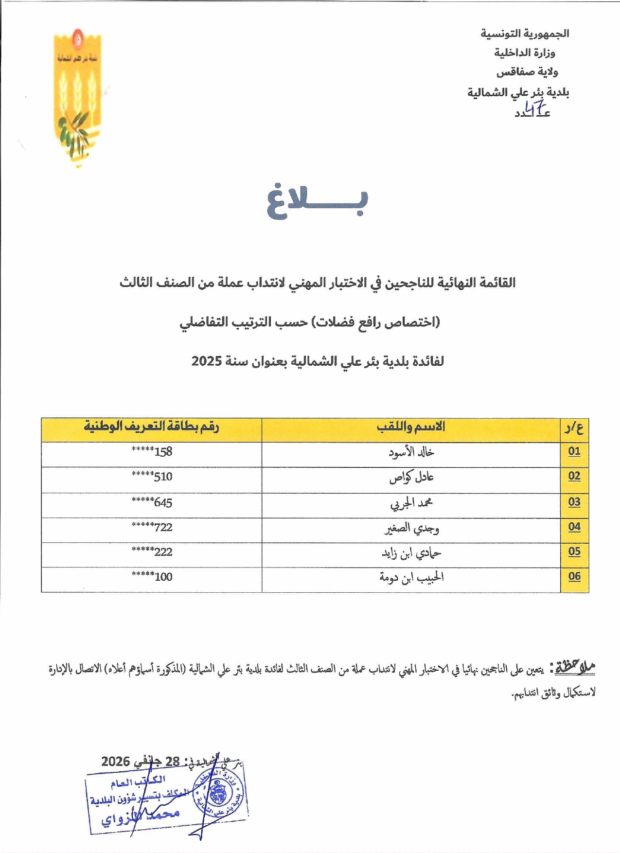 القائمة النهائية للناجحين في الاختبار المهني لانتداب عملة وقتيين من الصنف الثالث (اختصاص رافع فضلات) حسب الترتيب التفاضلي لفائدة بلدية بئر علي الشمالية بعنوان سنة 2025